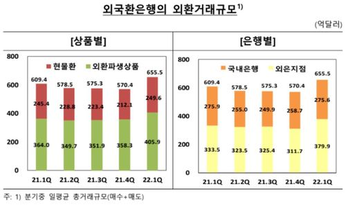 (서울=연합뉴스) 김유아 기자 = 최근 우크라이나 사태에 따라 환율 변동성이 커진 영향 등으로 올해 1분기(1∼3월) 하루 평균 외환거래액이 역대 최대치를 기록했다.