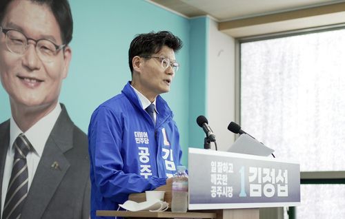 (공주=연합뉴스) 이은파 기자 = 재선에 도전하는 더불어민주당 소속 김정섭(56) 충남 공주시장이 26일 자신의 선거사무소에서 기자회견을 열어 "공주를 행정수도권의 중추도시로 육성하고 충청권 메가시티 중핵으로 도약시키겠다"고 밝혔다.