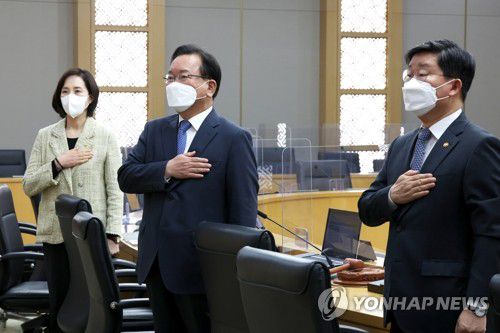 국기에 경례하는 김부겸 총리와 국무위원들 |