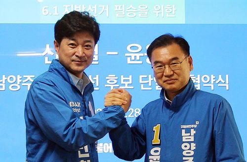 (남양주=연합뉴스) 김도윤 기자 = 경기 남양주시장 선거에 출마하려는 더불어민주당 신민철·윤용수 예비후보가 28일 단일화에 전격 합의했다.