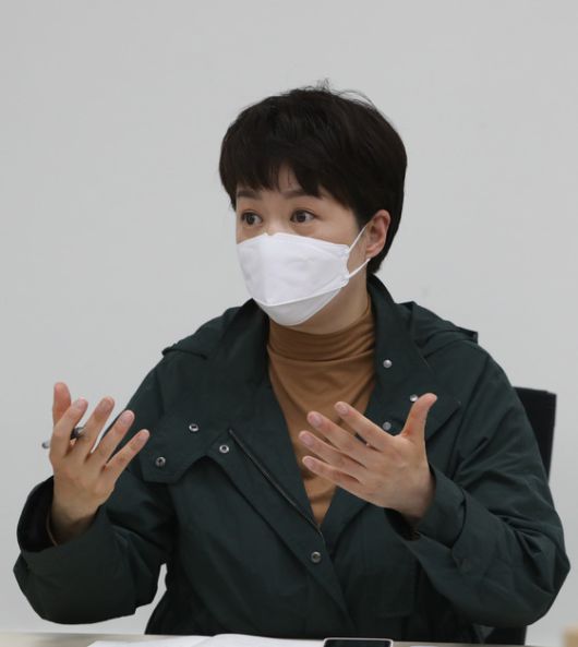김은혜 국민의힘 경기도지사 후보가 26일 오전 경기 수원 팔달구 정조인문예술재단에서 열린 '수원 군공항 이전 관련 간담회'에서 발언을 하고 있다. 2022.4.26/뉴스1 |