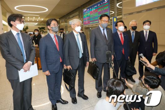 (인천공항=뉴스1) 안은나 기자 = 윤석열 대통령 당선인의 한일 정책협의 대표단 단장인 정진석 국민의힘 의원이 28일 오후 인천국제공항 2터미널을 통해 귀국한 뒤 소감을 밝히고 있다. 협의단은 4박5일 방일기간 동안 기시다 후미오 일본 총리를 비롯해 마쓰노 히로카즈 관방장관, 하야시 요시마사 외무상, 하기우다 고이치 경제산업상, 기시 노부오 방위상, 아베 신조 전 총리 등을 면담했다. 2022.4.28/뉴스1