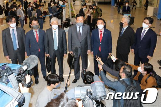 (인천공항=뉴스1) 안은나 기자 = 윤석열 대통령 당선인의 한일 정책협의 대표단 단장인 정진석 국민의힘 의원이 28일 오후 인천국제공항 2터미널을 통해 귀국한 뒤 소감을 밝히고 있다. 협의단은 4박5일 방일기간 동안 기시다 후미오 일본 총리를 비롯해 마쓰노 히로카즈 관방장관, 하야시 요시마사 외무상, 하기우다 고이치 경제산업상, 기시 노부오 방위상, 아베 신조 전 총리 등을 면담했다. 2022.4.28/뉴스1