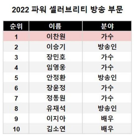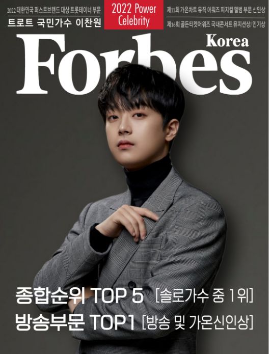 (엑스포츠뉴스 이정범 기자) 이찬원이 포브스 코리아 선정 '2022 파워 셀러브리티'에서 TOP 5, 방송 부문에서는 1위에 등극했다.