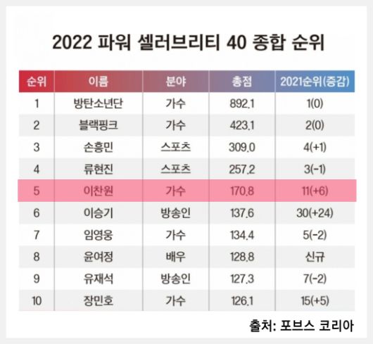 말 그대로 소득과 활약을 종합적으로 합산한 지수인 셈. 그런 '코리아 파워 셀러브리티' 지수에서 이찬원은 지난해보다 무려 6계단 상승해 솔로 가수 중 1위에 해당하는 TOP5에 올랐다. 이 지수의 1위부터 4위는 각각 BTS, 블랙핑크, 손흥민, 류현진 등 글로벌 스타가 차지했다.
