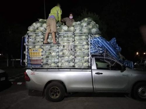 밀입국 미얀마인들을 배추 봉지 더미 안에 몰래 숨긴 픽업 트럭. |