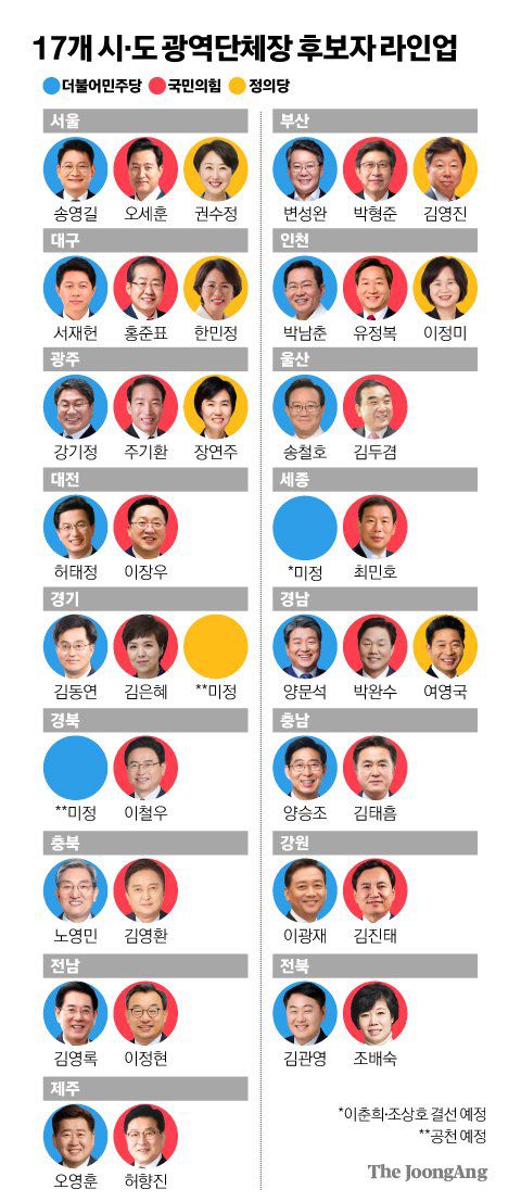 17개 광역 시도단체장 후보자 라인업. 그래픽=김경진 기자 capkim@joongang.co.kr |