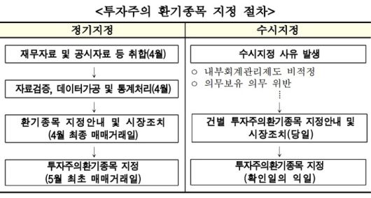 투자주의 환기종목은 투자주의가 필요한 기업을 일반투자자가 사전에 인지할 수 있도록 일정한 부실위험 기준에 해당하는 경우 지정하는 제도다. 정기지정과 수시지정으로 구분한다.