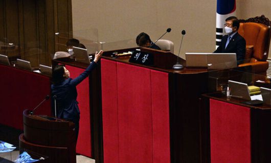 국민의힘 배현진 의원은 ‘임시회 회기 결정의 건’이 처리된 후 의사진행 발언을 신청해 단상에 올라 박병석 의장을 겨냥해 “무소속이어야 할 국회의장이 노골적인 민주당의 일원으로서 국회 자살행위를 방조한 것에 대해 저는 국민의 뜻에 담아 항의의 뜻과 함께 인사를 거부하겠다”며 “저희가 ‘제발 멈추라’고 했는데도 (박 의장이) 당신의 그 앙증맞은 몸을 저희 의원 위로 밟고 지나가고 구둣발로 여성들을 걷어차며 국회의장석으로 올라갔다"고 비난했다. 배 의원은 "당신이 얘기하는 민주주의가 이런 것이냐"며 박 의장을 향해 삿대질했다.