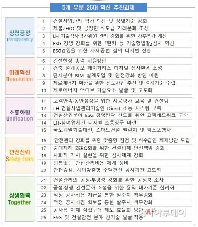 아시아투데이 이철현 기자 = 한국토지주택공사(LH)가 올해 건설문화 혁신을 위한 5개 부문 26개 혁신과제를 추진한다.