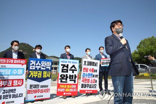 (서울=연합뉴스) 홍지인 기자 = 국민의힘은 1일 청와대 앞에서 이른바 '검수완박'(검찰 수사권 완전 박탈)에 항의하며 문재인 대통령의 거부권 행사를 촉구하는 피켓 시위를 벌였다.