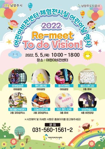 남양주어린이비전센터는 5일 로봇 탑승·조종, 과일 케이크 만들기, 꽃바구니 만들기, 사탕 꽃 만들기 등 다채로운 체험 행사를 마련하고 관람차, 회전목마 등 놀이기구 5종을 운영한다.