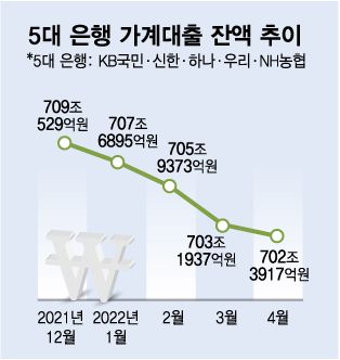 2일 은행권에 따르면 KB국민·신한·하나·우리·NH농협 5대 은행의 지난달 가계대출 잔액은 702조3917억원으로 집계됐다. 지난달보다 소폭(0.11%) 줄었다. 가계대출은 올 들어 1~4개월 넉달 연속 감소세를 그렸다. 고금리 여파가 고스란히 반영됐다.