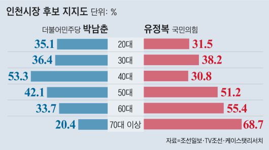 유정복·박남춘 후보는 전현직 인천시장이다. 유 후보는 2014년 지방선거에서 당시 인천시장이던 송영길 전 민주당 대표를 누르고 당선됐다. 2018년에는 박 후보가 유 후보를 다시 꺾었다. 리턴매치로 치러지는 이번 선거에서 두 후보는 2030세대 젊은 층에서 접전을 벌이고 있는 것으로 조사됐다. 20대(18~29세)에서 유 후보 지지도는 31.5%, 박 후보는 35.1%였다. 30대에서는 유 후보 지지율이 38.2%, 박 후보는 36.4%였다.