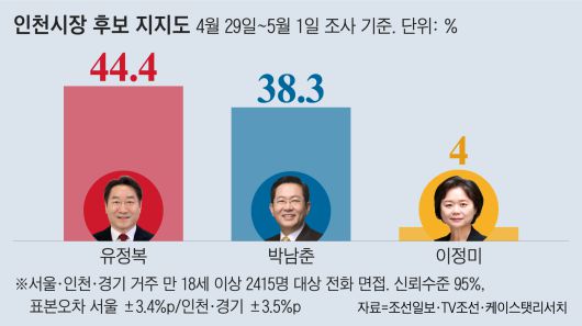 조선일보와 TV조선이 케이스탯리서치에 의뢰한 인천시장 적합도 여론조사에서 국민의힘 유정복 후보 44.4%, 더불어민주당 박남춘 후보는 38.3%의 지지도를 얻은 것으로 나타났다. 두 후보의 격차 6.1%포인트는 오차 범위 안이다. 정의당 이정미 후보는 4%였다. ‘지지하는 후보 없음·모름·무응답’이라고 응답한 유권자도 12.6%에 달했다. 지난 대선 때 인천에서는 민주당 후보였던 이재명 전 경기지사가 48.9% 득표하면서 윤석열 당선인(47%)을 근소한 격차로 앞선 바 있다.