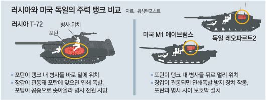 1971년 양산된 소련제 T-72 탱크는 탄환이 포탑과 포격병, 지휘병 바로 아래 저장된다. 미국이 우크라이나군에 제공한 재블린 등 대전차 미사일이 T-72의 비교적 얇은 측면 장갑을 관통해 내부에 저장돼 있던 탄환에 맞으면 연쇄 폭발이 일어난다. 탱크 내부에 있던 병사는 사망하고 포탑은 공중으로 날아간다. 전문가들은 “우크라이나군이 러시아 탱크의 이 같은 결함을 최대한 이용하고 있다”고 했다.
