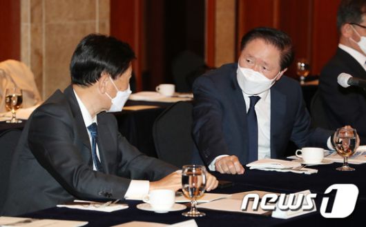(서울=뉴스1) 박세연 기자 = 우기홍 대한항공 대표이사와 정성권 아시아나항공 대표이사가 3일 오전 서울 중구 소공동 롯데호텔에서 열린 대한상의 제24차 관광산업위원회에서 대화를 나누고 있다. 2022.5.3/뉴스1psy5179@news1.kr[© 뉴스1코리아(news1.kr), 무단 전재 및 재배포 금지]