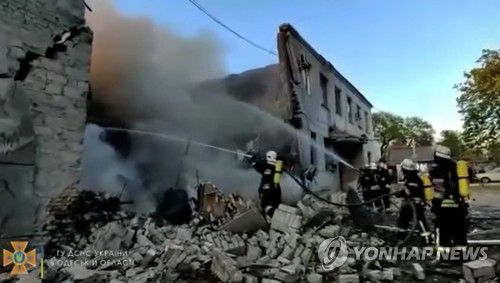 미사일 피격 건물 불 끄는 우크라 소방대원 |