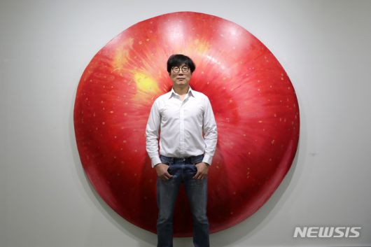 [서울=뉴시스] 박진희 기자 = '사과작가' 윤병락의 개인전 '윤병락 : 아카이브' 전시가 열린 3일 서울 강남구 호리아트스페이스에 작품 'Autumn's Fragance-Cosmos'(2019)가 사과모양의 대형 '변형 캔버스'에 그려져 전시되어 있다. 국내외 아트페어와 기획전, 유명 아트옥션과 갤러리에 러브콜이 끊이지 않는 작가이며, '솔드아웃 작가'라는 별명을 가지고 있다. 전시는 오는 6월 18일까지. 2022.05.03. pak7130@newsis.com