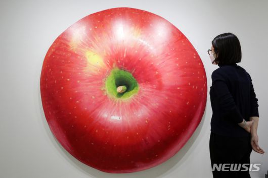 [서울=뉴시스] 박진희 기자 = '사과작가' 윤병락의 개인전 '윤병락 : 아카이브' 전시가 열린 3일 서울 강남구 호리아트스페이스에 작품 'Autumn's Fragance-Cosmos'(2019)가 사과 모양의 '변형 캔버스'에 그려져 전시되어 있다. 국내외 아트페어와 기획전, 유명 아트옥션과 갤러리에 러브콜이 끊이지 않는 작가이며, '솔드아웃 작가'라는 별명을 가지고 있다. 전시는 오는 6월 18일까지. 2022.05.03. pak7130@newsis.com