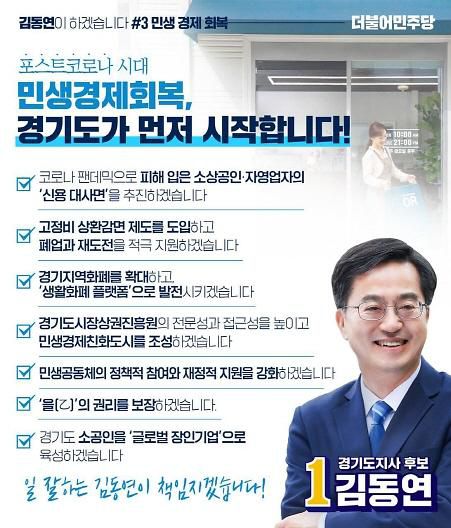 김 후보는 그러면서 “△사업장의 고용유지 인건비와 임대료를 감면하는 '경기도형 고정비 상환감면 프로그램' 도입, △경기지역화폐 확대, △경기도시장상권진흥원의 전문성 강화, △상인회 등 민생공동체의 정책 참여 및 재정 지원, △가맹점·납품업체 등 을(乙)의 권리 보장, △글로벌 장인기업 육성 등도 실시하겠다”고 덧붙였다.