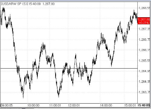 이날 환율은 역외 환율 상승을 따라 2.10원 오른 1267.20원에 시작한 뒤 외환당국의 개입 경계, 호주 중앙은행의 기준금리 인상에 따른 미 달러인덱스 상승세 멈춤 등의 영향에 오전 중 1263.30원까지 떨어져 하락 전환하는 등 혼조세를 보이다가 오후로 갈 수록 다시 우상향 하는 그림을 나타냈다.