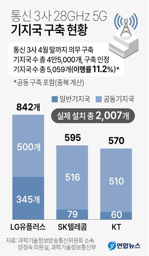 앞서 과기정통부는 통신 3사의 28㎓ 기지국수가 의무 구축수량 대비 10% 미만일 경우 주파수 할당을 취소하겠다고 밝혔다. 이통 3사의 기지국 구축 실적은 제재 기준인 10%를 겨우 넘겼다. 그나마 구축 수량으로 ‘인정’된 기지국 5059개 가운데 4578개는 통신사들이 공동으로 구축한 뒤 각 회사별 통계에 중복 포함시켰다.
