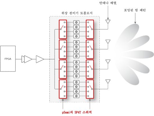 위상 천이를 선택할 수 있는 피세미 SP4T 스위치를 두 개씩 앞뒤로 연결해 하이브리드 빔포밍 아키텍처에서 쓰이는 아날로그 빔 제어를 구현할 수 있다. 이러한 위상 천이기 토폴로지는 능동형 안테나 시스템에서 안테나 빔 조향과 제어를 개선한다. |
