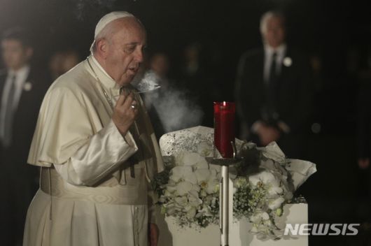 [히로시마=AP/뉴시스]2019년 11월 일본을 방문한 교황 프란치스코가 원자폭탄 피해자들을 기리는 히로시마 평화기념공원에서 촛불에 불을 붙이는 모습. 2019.11.24. |