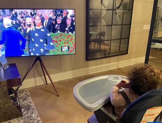 캠벨은 지난 해 5월 50세의 나이에 딸을 얻었다. 그리고 그는 최근 SNS에 생후 10개월 된 딸이 의자에 앉아 미국 뉴욕 메트로폴리탄 미술관에서 열린 '2022 멧 갈라' 행사에 등장한 엄마를 텔레비전을 통해 보고 있는 모습을 게재했다.