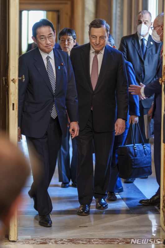 [로마=AP/뉴시스] 이탈리아를 국빈 방문 중인 기시다 후미오 일본 총리가 4일(현지시간) 마리오 드라기 이탈리아 총리와 함께 로마 정부 청사에 도착하고 있다. 2022.05.05. |