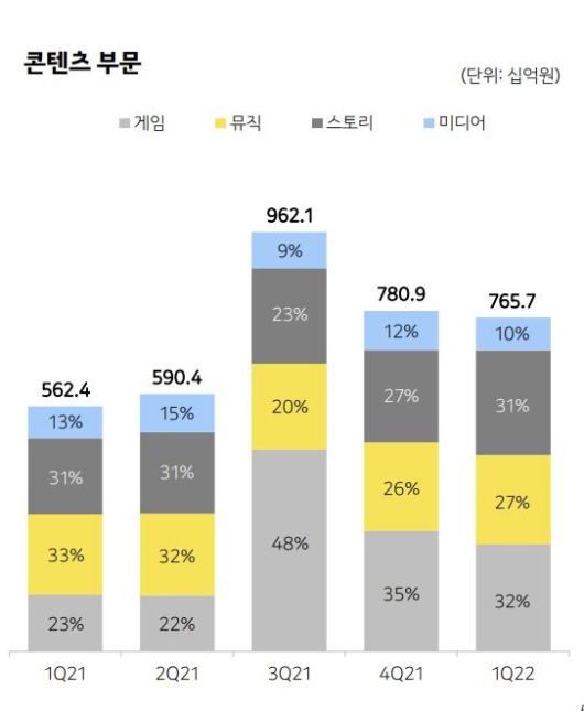 카카오 1분기 콘텐츠 매출은 전년동기대비 36% 증가한 7657억원이다. 구체적으로 ▲스토리 2405억원 ▲뮤직 2044억원 ▲미디어 750억원 ▲게임 2458억원이다. 1분기 카카오엔터테인먼트 통합 거래액은 전년동기대비 38% 늘어난 9310억원이다.