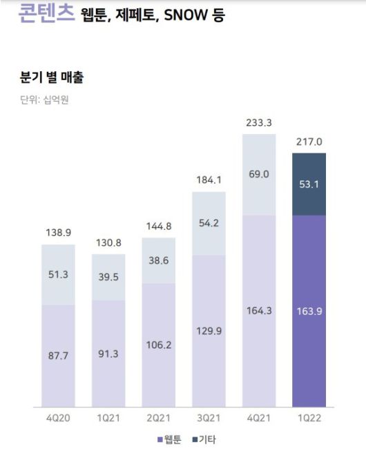 네이버는 한국채택국제회계기준(K-IFRS) 연결기준 올해 1분기 콘텐츠 매출 2170억원을 기록했다. 전년동기대비 65.9% 증가한 수치로, 5대 사업부문 중 가장 큰 성장 폭이다.