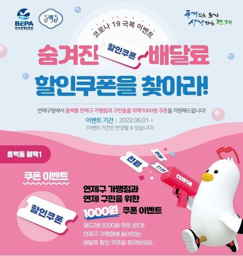 사용 방법은 동백통 앱 내 연제구 음식점 주문화면에서 '배달료 지원 할인쿠폰 1천원'을 내려받으면 된다.