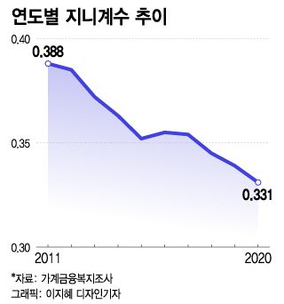 국민들의 소득분배지표는 개선된 것으로 나타났다. 가계금융복지조사에 따르면 한국의 지니계수는 지난 2016년 0.355에서 0.331로 0.024포인트 하락했다. '불평등지수'로도 불리는 지니계수는 소득이 얼마나 불균등하게 분배되는지 알려주는 지표로, 0(완전평등)에 가까울수록 평등하고 1(완전불평등)에 가까울수록 불평등하다. 10년 전인 2011년(0.388)에 비해서는 0.057포인트 개선됐다.
