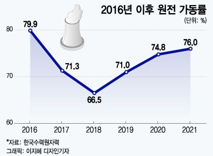 7일 한국수력원자력에 따르면 현재 우리나라 원전 설비용량은 2만3250㎿(메가와트), 지난해 연간 가동률은 76%로 집계됐다. 문재인정부 출범 이전인 2016년 79.9%였던 원전 가동률은 문재인 대통령의 탈원전 선언이 있었던 2017년 71.3%로, 이듬해인 2018년 66.5%까지 급락했다. 이후 원전 가동률은 경기침체와 코로나19 대응 과정에서 △2019년 71% △2020년 74.8% 등으로 재상승했다.