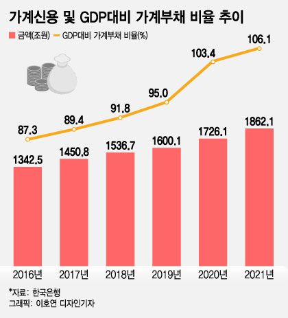 경제규모 성장과 함께 가계빚은 자연스럽게 증가하지만 속도가 문제다. 2020년 처음으로 GDP(국내총생산)보다 가계부채가 더 많은 상황에 이르렀고, 지난해 GDP대비 가계부채 비율은 106.1%로 집계됐다. 5년 사이 18.8%포인트 상승했다. 비율과 증가속도 모두 세계 최고 수준이다.