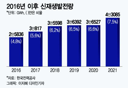 한편 문재인정부가 수소 등 신재생 에너지 발전의 기반을 마련했다는 평가도 있다. 2016년 2만5836GWh에 그쳤던 신재생에너지 발전량은 지난해 4만3085GWh로 66.8% 불어났다. 그린뉴딜을 포함해 태양광과 풍력 등 신재생 에너지 확대에 적극적으로 나선 결과다.