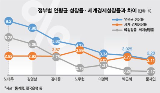 전통적으로 우리나라의 경제성장률은 대개 세계 전체 경제성장률을 웃돌았는데, 그 차이도 문재인정부에서 가장 작았다. 문재인정부 연평균 성장률은 약 2.3%로 해당기간 세계 경제성장률(세계은행 기준) 평균 2.11%과의 격차는 0.17%포인트(p)에 그쳤다. △노태우정부 6.28%p △김영삼 정부 5.06%p △김대중 정부 2.75%p △노무현 정부 0.75%p △이명박정부 1.31%p △박근혜정부 0.26%p에 비해 차이가 줄었다.