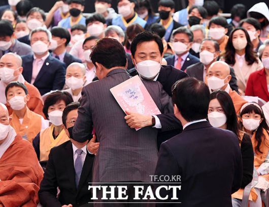 [더팩트|이선화 기자] 오세훈 서울시장이 8일 오전 서울 종로구 조계사에서 열린 '불기2566년 부처님 오신날 법요식' 에서 송영길 더불어민주당 서울시장 후보와 인사를 나누고 있다.