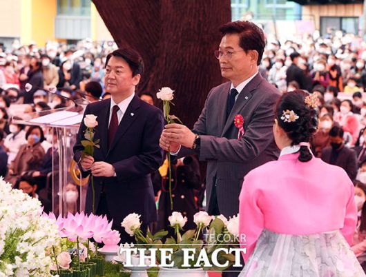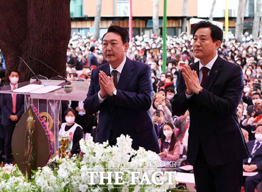 이날 조계사에서 열린 봉축 법요식에는 국민의힘 서울시장 후보인 오세훈 서울시장과 더불어민주당 후보인 송영길 후보가 함께 참석했다. /인수위사진기자단 |