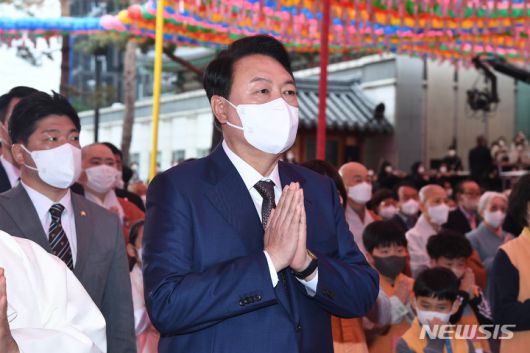 [서울=뉴시스] 인수위사진기자단 = 윤석열 대통령 당선인이 8일 오전 서울 종로구 조계사에서 열린 '불기2566년 부처님오신날 법요식'에 참석해 합장하고 있다. 2022.05.08. photo@newsis.com |