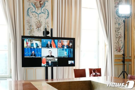 주요 7개국(G7) 정상들이 8일(현지시간) 우크라이나 사태와 관련해 볼로디미르 젤렌스키 우크라이나 대통령과 함께 화상회의를 하고 있다. 사진은 프랑스 대통령궁인 엘리제궁에서 촬영한 G7 정상들의 비디오 화면. © 로이터=뉴스1 © News1 김현 특파원 |