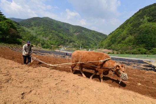 충북 단양군 가곡면 들녘에서 한 농부가 소를 부려 고추 밭을 갈고 있다. 지세가 험한 이 마을은 농기계 사용이 어려워 일부 농가에서는 여전히 우경에 의존하고 있다. 충북농업기술원 제공 |