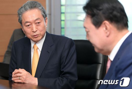 (서울=뉴스1) 인수위사진기자단 = 9일 서울 종로구 통의동 대통령직인수위원회에서 하토야마 유키오 전 일본 총리가 윤석열 대통령 당선인과 대화하고 있다. 2022.5.9/뉴스1 photo_desk[© 뉴스1코리아(news1.kr), 무단 전재 및 재배포 금지]