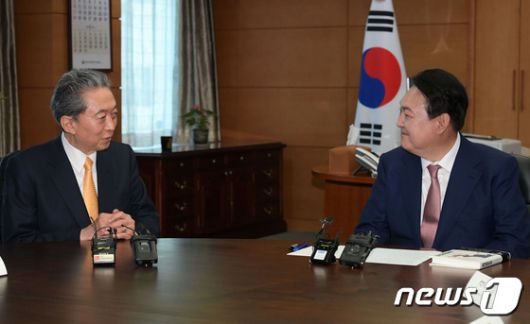 (서울=뉴스1) 인수위사진기자단 = 윤석열 대통령 당선인이 9일 서울 종로구 통의동 대통령직인수위원회 집무실에서 하토야마 유키오 전 일본 총리를 접견하고 있다. 2022.5.9/뉴스1photo_desk[© 뉴스1코리아(news1.kr), 무단 전재 및 재배포 금지]