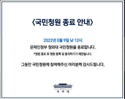 청와대 국민청원 게시판은 이날 공지를 통해 “9일 낮 12시 문재인 정부 청와대 국민청원을 종료한다”며 “청원 종료 후 청원 등록 및 동의하기가 제한된다. 그동안 국민청원에 참여해 주신 여러분께 감사드린다”고 전했다.