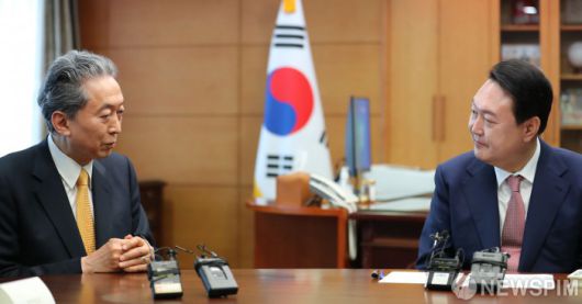 [서울=뉴스핌] 인수위사진기자단 = 윤석열 대통령 당선인이 9일 오후 서울 종로구 통의동 인수위원회 집무실에서 하토야마 유키오 전 일본 총리를 접견하고 있다. 2022.05.09 photo@newspim.com 저작권자(c) 글로벌리더의 지름길 종합뉴스통신사 뉴스핌(Newspim), 무단 전재-재배포 금지