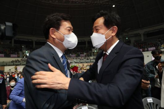 오세훈(오른쪽) 서울시장과 송영길 더불어민주당 전 대표가 지난 4일 서울 장충체육관에서 열린 제50회 어버이날 기념행사에서 인사를 나누고 있다.(사진=뉴시스) |