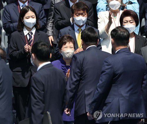 윤 당선인은 이어 단상에 자리한 전체 인사들을 향해 90도 인사를 했다. 윤 대통령의 바로 앞에 자리 잡은 박 전 대통령은 연신 박수로 화답했다.